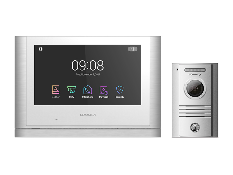 Sada handsfree videotelefonu s 10" dotykovou Full HD obrazovkou a celokovové dveřní stanice s povrchovou montáží. Videotelefon má videopaměť a umožňuje adresnou interkomovou komunikaci s dalšími videotelefony na stejné adrese.