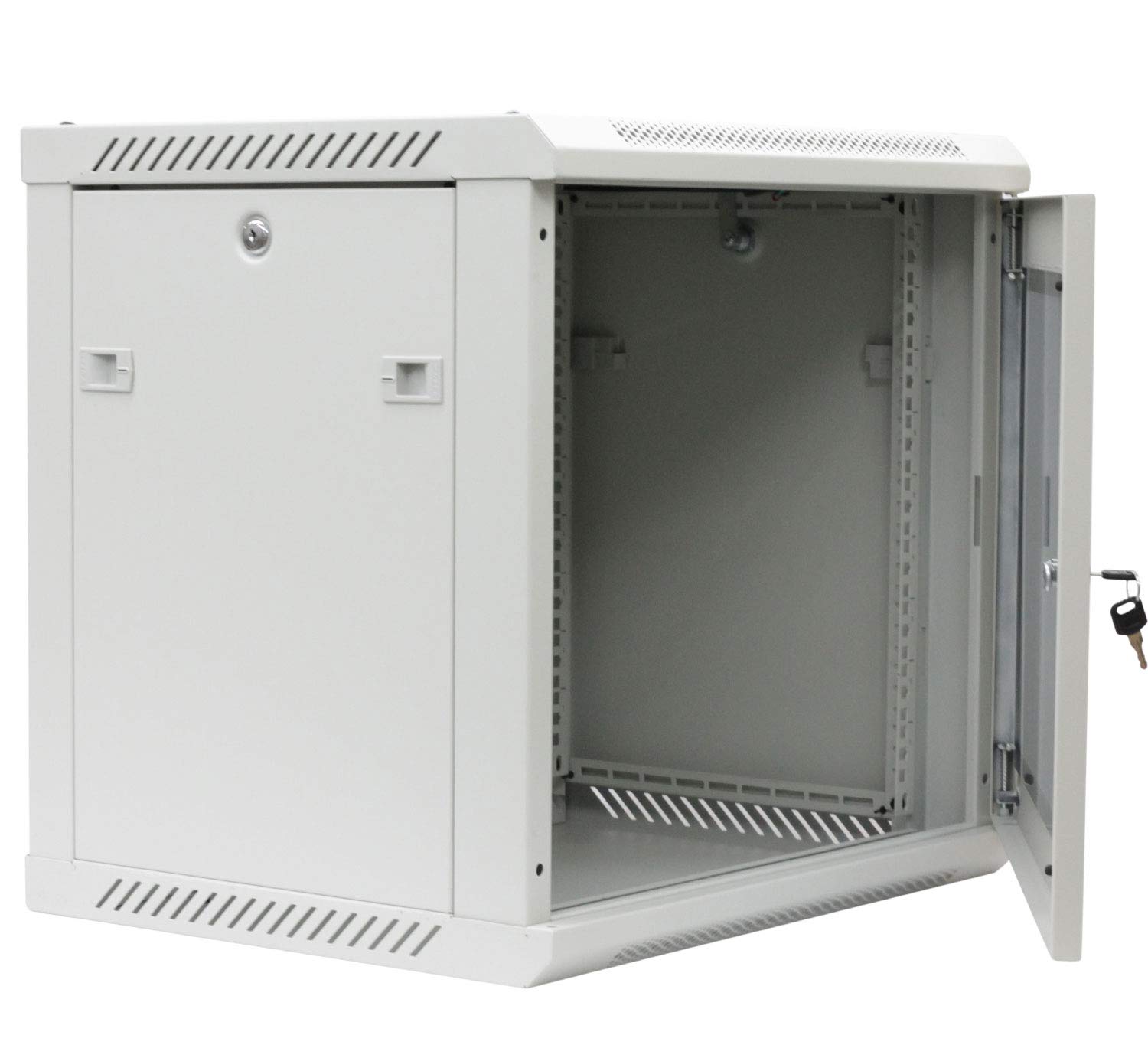 19“ nástěnný datový rozvaděč se skleněnými dveřmi a odnímatelnými bočnicemi. Dodávaný v rozloženém stavu, což usnadňuje transport a manipulaci. Stabilní montovaná konstrukce, skelet z ocelového plechu, šedá barva. Vhodné pro malé sítě nebo koncová místa velkých sítí.