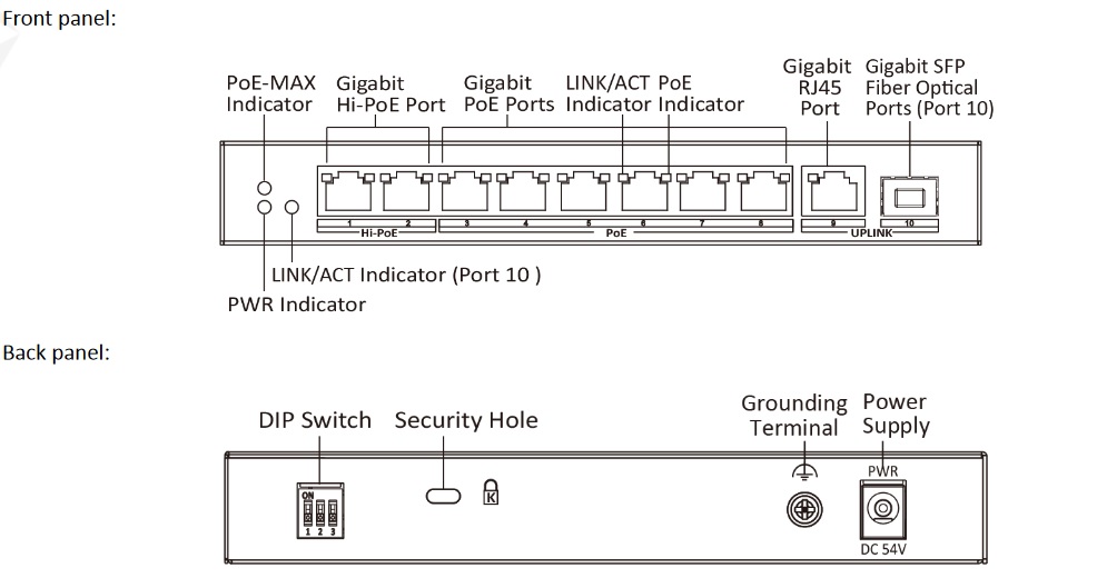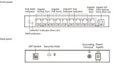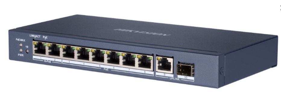 10/8 PoE switch, 6x 1Gbps PoE+ (30W) + 2x 1Gbps Hi-PoE (90W) porty, 1x uplink port 1Gbps, 1x uplink port 1Gbps SFP. Dva pracovní režimy: Standard 1Gbps na 100m a Extended mode 10Mbps až na 300m(pouze porty 7 a 8).Funkce PoE watchdog(automatický restart portu, pokud kamera neodpovídá, Network protokol IEEE802.3, IEEE802.3af, IEEE802.3at, 802.3u, 802.3x. Max. celkový výkon PoE 110W. Přepínací kapacita switche 20Gbps. Přepěťová ochrana do 6KV. Pracovní teplota: -10 až 40C°. Napájení: 230Vac.