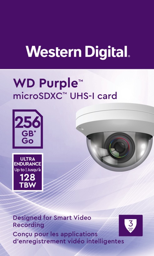 Paměťová karta MicroSDXC256GB WD Purple pro kamerové systémy, čtení 100MB/s, zápis 60MB/s, nepřetržitý záznam, vhodná pro venkovní kamery.