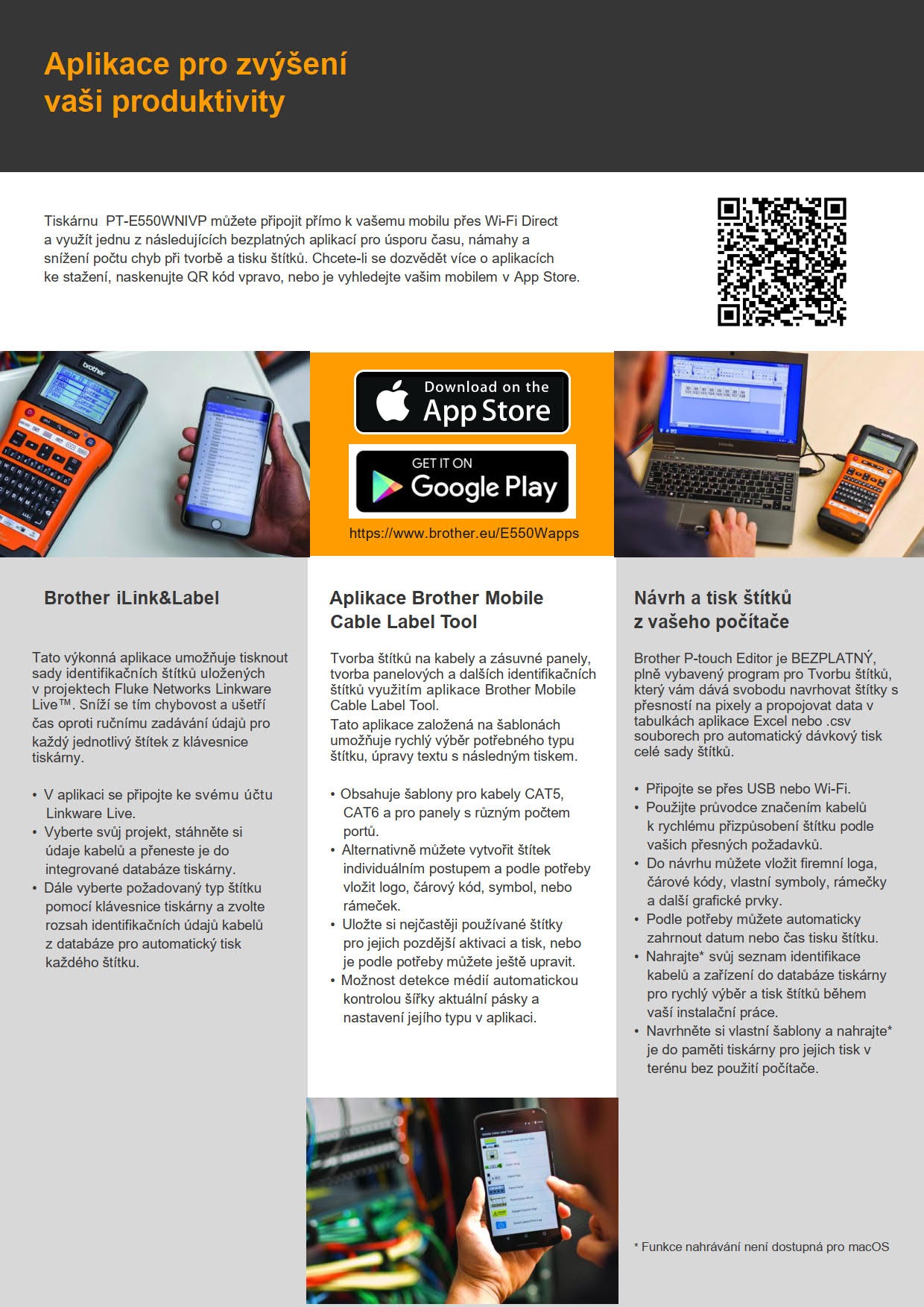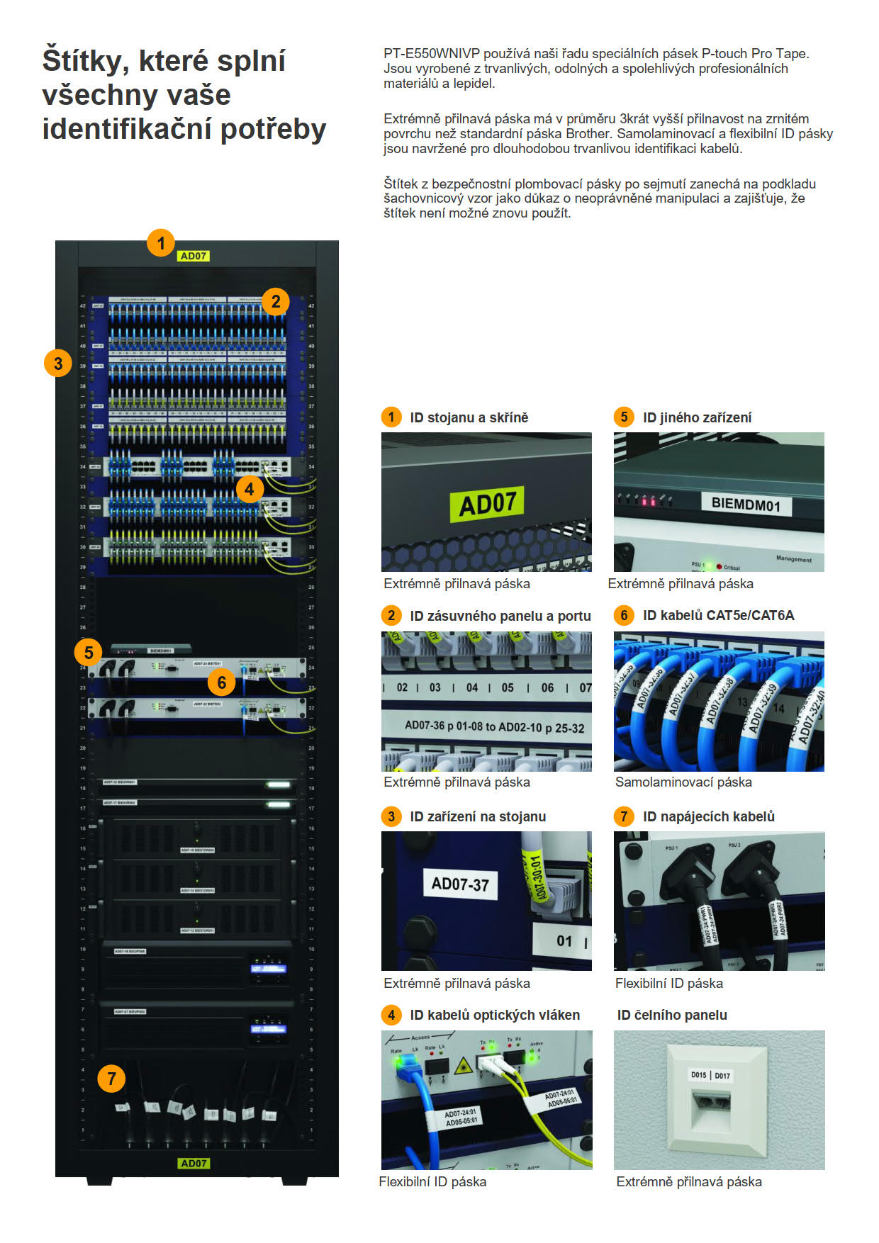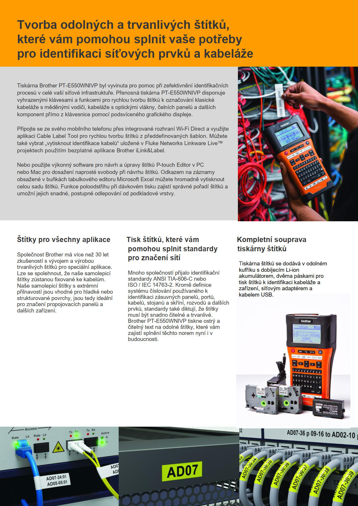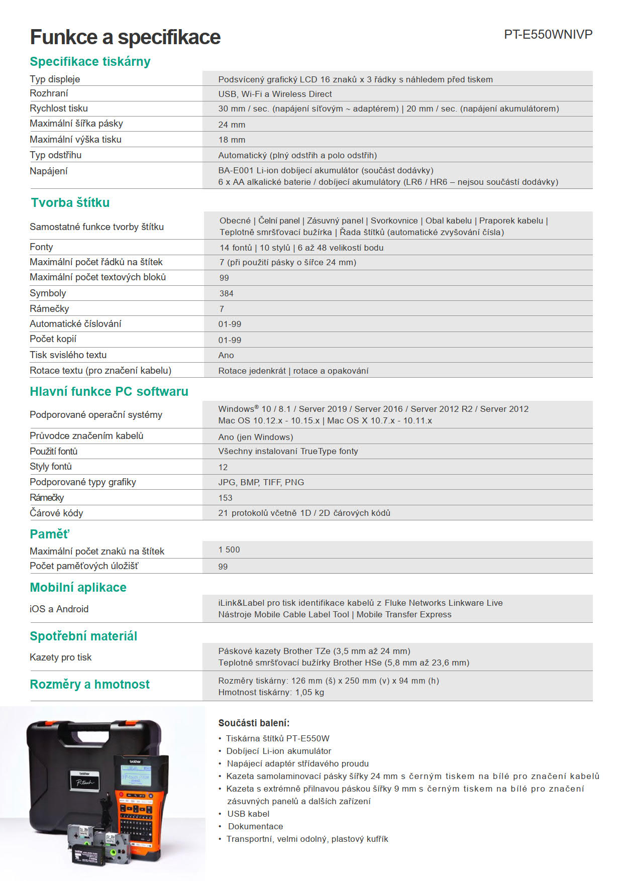 Tiskárna s podporou Wi-Fi připojení pro okamžitou tvorbu odolných štítků pro identifikaci síťových kabelů, zásuvných panelů a dalších zařízení v síťové infrastruktuře, ale i pro použití v kanceláři nebo domácnosti. Lze použít samostatně, tisknout z počítače, nebo využít některé z dostupných aplikací pro mobilní telefony. Klíčové vlastnosti: Specializované funkce pro návrh štítků kabelů, zásuvných a čelních panelů; Bezplatná aplikace tisku více štítků uložených ve vašem účtu Fluke Networks Linkware Live pro značení kabelů; Návrh a tisk štítků z počítače nebo mobilního telefonu; Jednotka odstřihu umožňuje štítek plně odstřihnout nebo jen nastřihnout tak, že štítky zůstávají na podkladovém pásku; Součástí balení jsou samolepicí standardní a extrémně přilnavé pásky TZE-S221 a TZE-SL251 , napájecí adaptér, li-ion akumulátor a kufřík. Tisk štítků šířky 3, 5, 6, 9, 12, 18 a 24 mm. Tisk tepelně smršťovacích trubiček typu HSE.