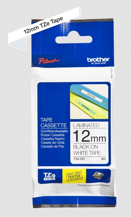 Kazeta TZe-231 s laminovanou páskou s černým tiskem na bílém podkladu je stejně praktická v domácnosti, kanceláři či pracovišti. Může být použita k identifikaci obsahu šanonů, regálů až po USB flash disky, značení kabeláže a dalších zařízení. Samolepicí laminované štítky z této kazety byly vyvinuty s důrazem na odolnost proti extrémním teplotám, chemikáliím, oděru, slunečnímu záření a působení vody tak, aby byly vhodné pro vnitřní i venkovní použití.