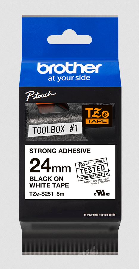 Páska Brother TZe-S251 s černým tiskem na bílém podkladu a extra silným lepidlem je ideální pro značení na hrubých a nerovných površích, jako jsou kovové skříňky nebo texturované plasty. Díky laminované vrstvě odolává vodě, chemikáliím, oděru, UV záření i extrémním teplotám. Měkčí složení lepidla zajišťuje lepší přilnavost a dlouhou životnost štítků i v náročných podmínkách.