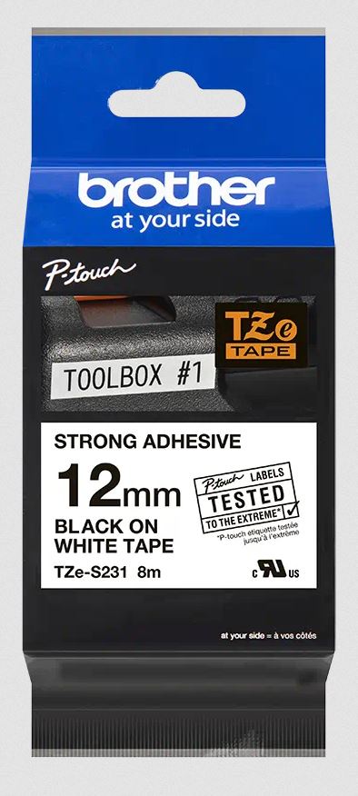 Páska Brother TZe-S231 s černým tiskem na bílém podkladu a extra silným lepidlem je ideální pro značení na hrubých a nerovných površích, jako jsou kovové skříňky nebo texturované plasty. Díky laminované vrstvě odolává vodě, chemikáliím, oděru, UV záření i extrémním teplotám. Měkčí složení lepidla zajišťuje lepší přilnavost a dlouhou životnost štítků i v náročných podmínkách.