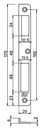Rozměry: v 170 x š 20 x h 8 mm, síla materiálu 2 mm