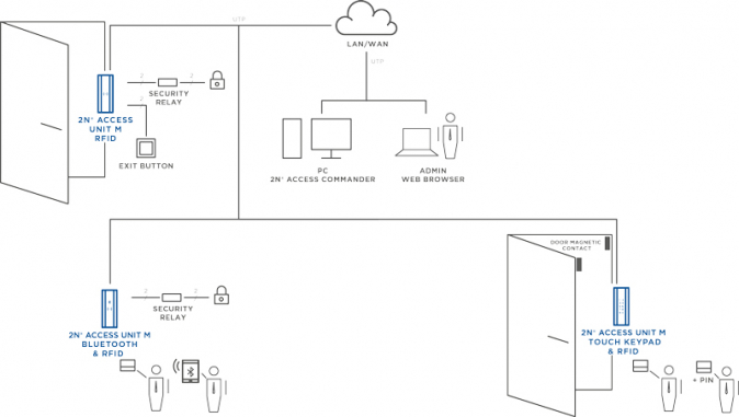 Access Unit M RFID Multi čte karty na frekvenci 125 kHz i 13.56 MHz, podporuje i mobilní NFC. Navíc v sobě zahrnuje i kontrolér s veškerou rozhodovací inteligencí. K instalaci a napájení stačí jeden UTP kabel.