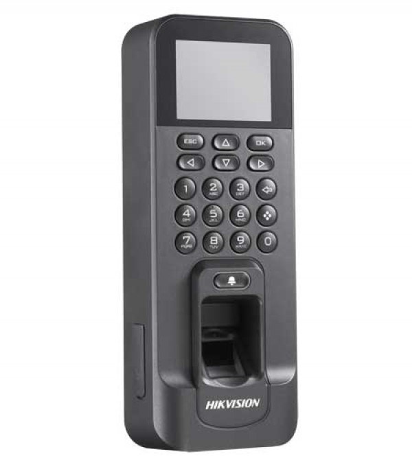 Biometrický přístupový IP terminál se čtečkou otisků prstů a RFID čtečkou EMmarine (125KHz). Terminál má LCD displej 2.4" se stálým zobrazením času a aktuální informací o ověření přístupu. Kapacita terminálu je 3000 uživatelů, počet uložených otisků prstů je 3000. Paměť událostí je na 100 000 záznamů. Vzdálená administrace terminálu z obslužného softwaru IVMS-4200 (AC). Terminál je určen pro fungování v autonomním režimu. Podpora exportu dat o docházce na USB flash disk. Automatické generování docházkových reportů se snadným prohlížením záznamů. Obsahuje vstupní a výstupní rozhraní 1x RS-485, 1x vstupní Wiegand (26/32), 1x výstupní Wiegand (26/32), 1x spínací kontakt na zámek, 1x kontakt pro odchodové tlačítko, 1x alarmový vstup, 1x alarmový výstup, 1x tamper. Provozní teplota je -10°C až 55°C, napájení 12 Vdc / 1A, rozměry 205 x 77 x 37mm.
