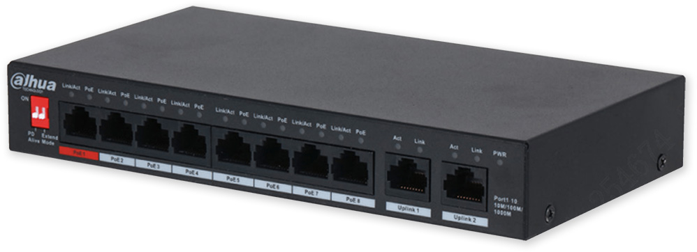 Popis portů: 8 x PoE 10/100/1000 Mbps, 2 x Uplink 10/100/1000 Mbps