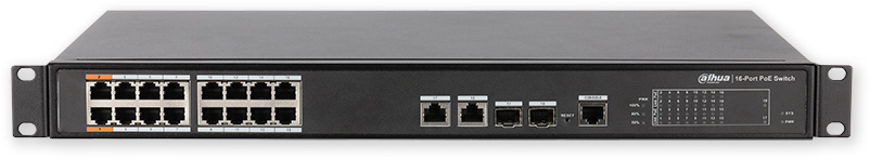 Výkonný PoE switch s metalickou i optickou páteří, management, 16 x PoE 10/100 Mbps, 2 x RJ45/SFP uplink 10/100/1000 Mbps Combo, norma 3af, 3at, 3bt Hi-PoE, celkový budget je 240 W, přepěťové ochrany, rack provedení.