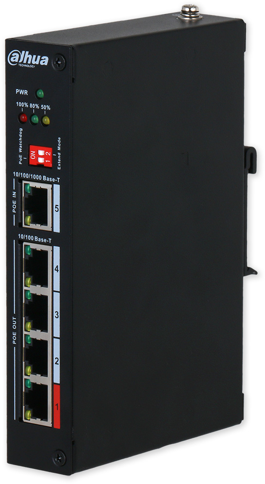 PoE extender, 4 x PoE 10/100 Mbps OUT, 1 x PoE uplink 10/100/1000 Mbps IN, IEEE802.3, 3u, 3x, 3ab, 3z, 3az, 3af, 3at, 3bt, Hi-PoE, celkový budget 90 W závisý na výkonu napájecího PoE zařízení, napájecí zdroj není součástí! přepěťové ochrany, desktop provedení, police nebo DIN, kov.