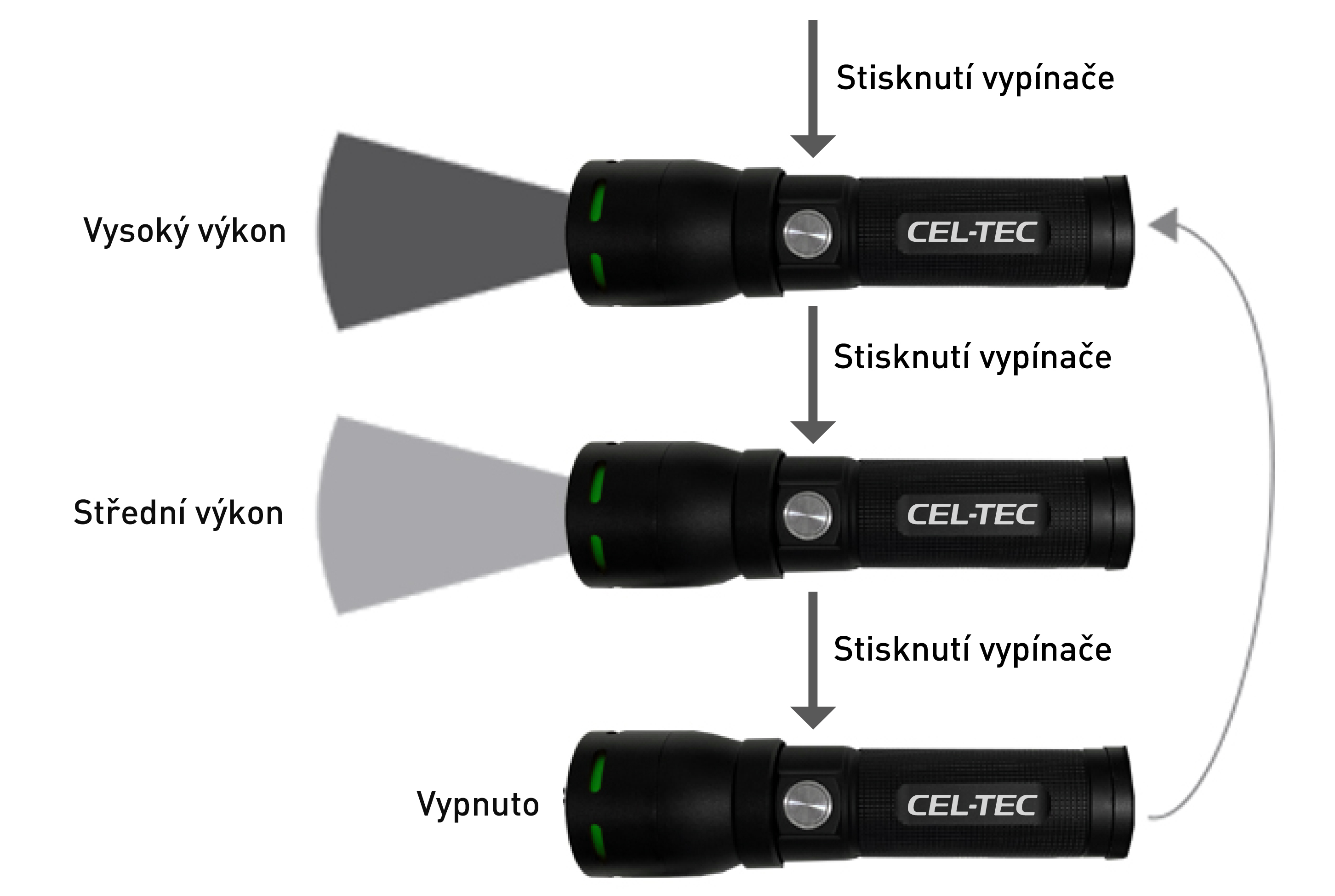 Upozornění: Jedná se o speciální Li-ion akumulátor 18650 se 3 póly. Při použití běžného článku 18650 nebude svítilna funkční.