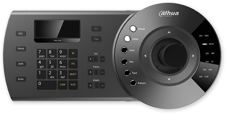Multifunkční klávesnice s elektromechanickým 3 vektorovým joystickem pro ovládání PTZ analogových a IP otočných kamera Dahua. Komunikace po síti (RJ45) i přímá po sériových portech (RS-232, RS-485) a USB. Protokoly DH-SD, DH-2, Pelco P/P1, Pelco D/D1.
