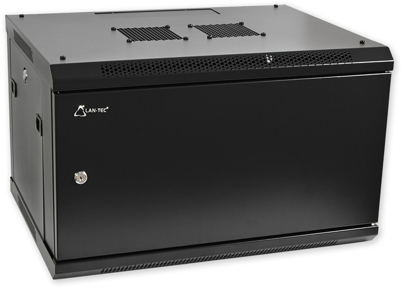19“ nástěnný datový rozvaděč s plechovými dveřmi a odnímatelnými bočnicemi, dodávaný ve složeném stavu. Stabilní montovaná konstrukce, skelet z ocelového plechu, černá barva. Vhodné pro malé sítě nebo koncová místa velkých sítí, plné plechové dveře chrání zařízení uvnitř rozvaděče ve volně přístupných místech.