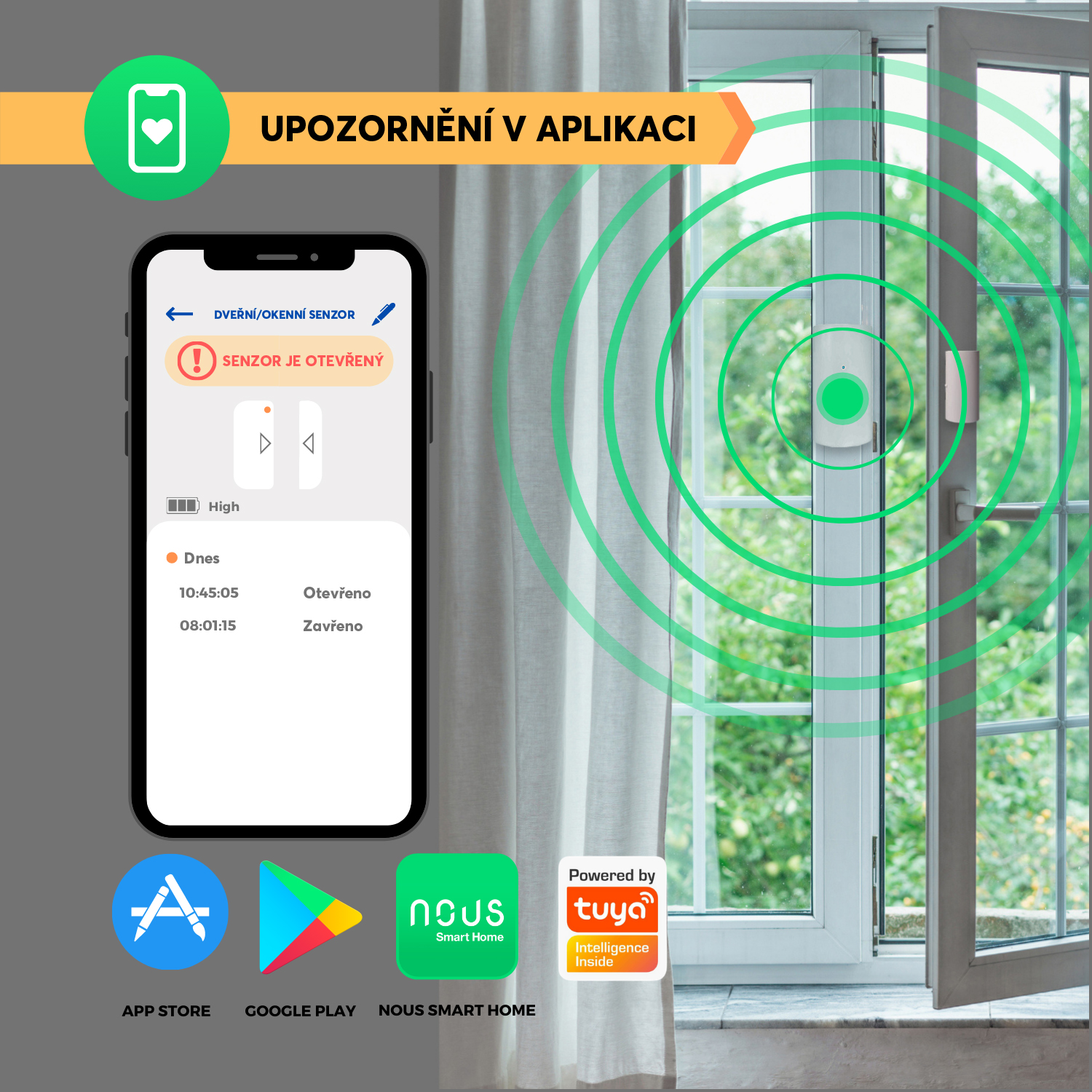 Díky magnetickému senzoru na dveře a okna NOUS E3 ZigBee Tuya budete v reálném čase a na dálku informováni o otevření okna nebo dveří ve vašem domě.