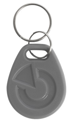 Přístupový duální čip LF-HF UID k systému JABLOTRON 100 ve tvaru přívěšku na klíče v šedém provedení. Duální čip podporuje technologii RFID (EM125) frekvence 125 kHz i MiFare (NFC) frekvence 13,56MHz.