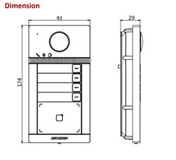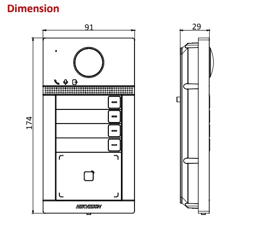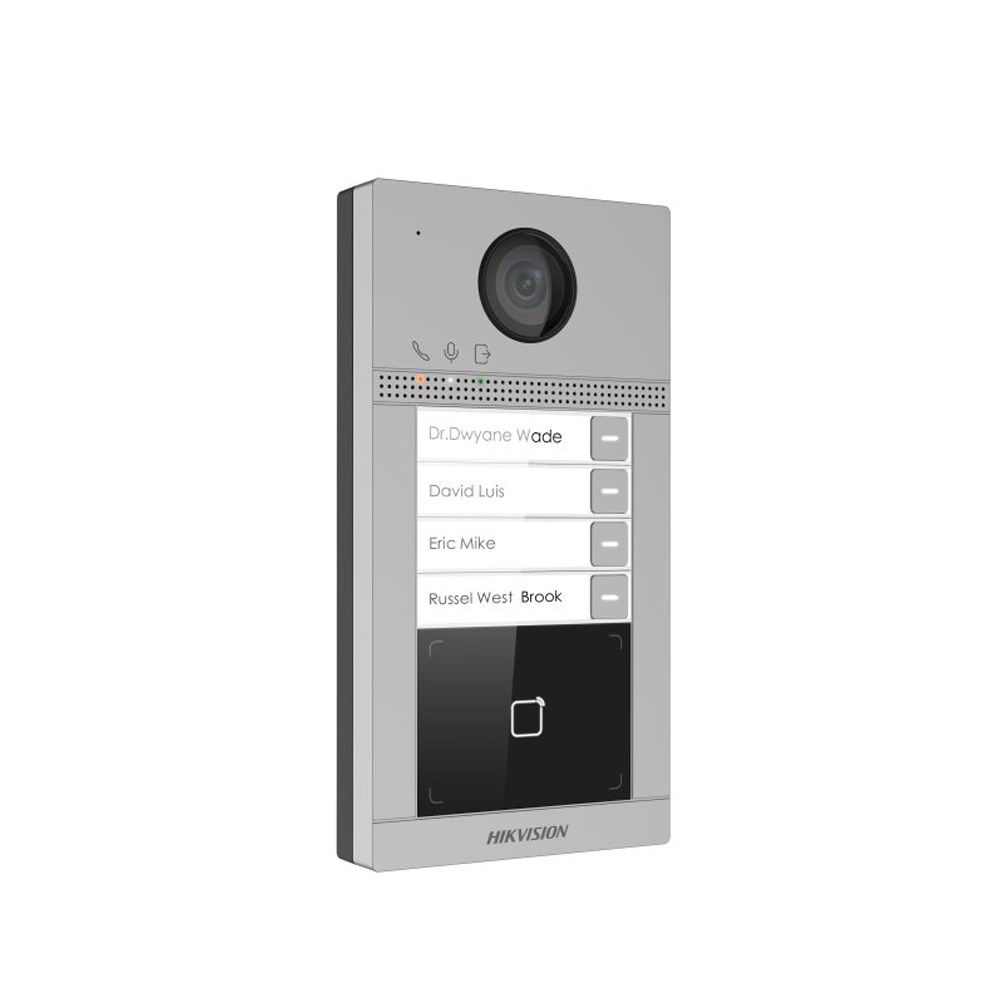Dveřní IP stanice s kamerou a 4 tlačítky, IP systém videotelefonů Hikvision 2. generace, umožňuje volání na vnitřní jednotku(monitor) a následně na mobilní telefon prostřednictvím cloudové služby od Hikvisionu a mobilní aplikace Hik-Connect, kovový čelní panel, antivandal certifikace IK8, zápustná instalace, rozlišení kamery 2Mpx (1920x1080); WDR, úhel záběru: horizontální 124° / vertikální 75°, rozhraní LAN 10/100Mbps + WiFi, RFID čtečka čipů/karet Mifare (13,56MHz), FLASH paměť 32MB, RAM 256MB, maximální počet uložených karet/čipů: 10 000, maximální počet uložených uživatelů: 2 000, 2x kontakt pro odchodové tlačítko, 1x RS485, 4x alarmový vstup, 1x tamper, 2x NO/NC kontakt pro zámek, pro napájení zámku je nutné použít externí napájecí zdroj, napájení 12 VDC nebo standardní PoE (48V), příkon 10W, IP65, IK08, provozní teplota -40°C až +53°C, rozměry 174 × 91 × 29 mm, balení obsahuje montážní box pro zápustnou montáž. Pozor, jedná se o novou HW verzi dveřní jednotky s označením (C) a nesmí se použít FW z předchozí HW verze s označením (B) na konci značení!!!