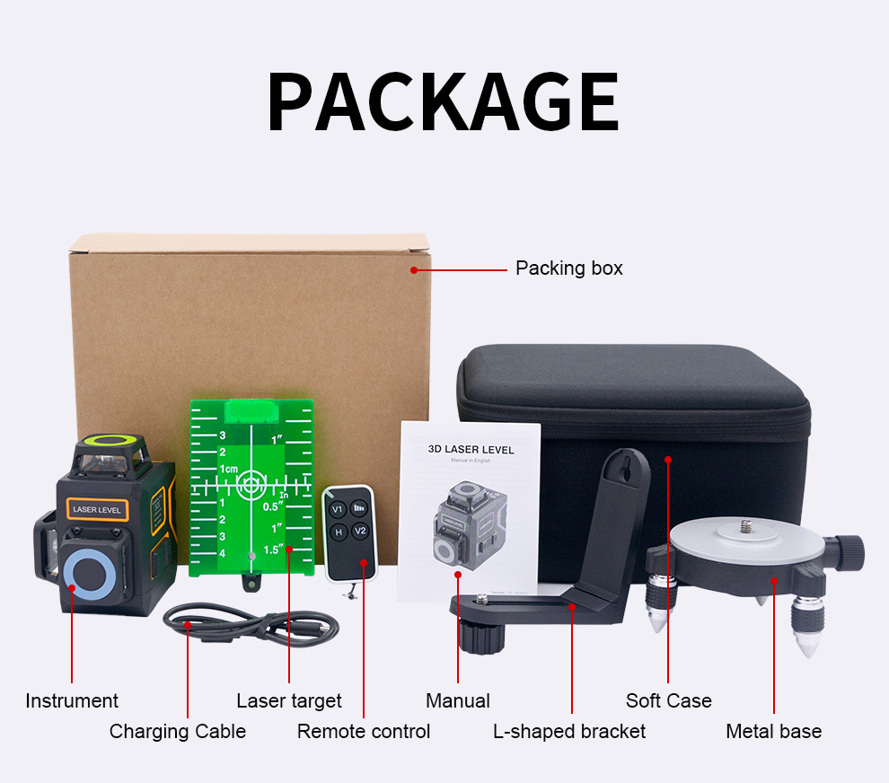 Obsah dodávky: liniový laser, dálkový ovladač, stojánek s možností přesného směrování, USB-C kabel, magnetický závěsný vertikální držák, kalibrační terč, ochranné pouzdro, český návod