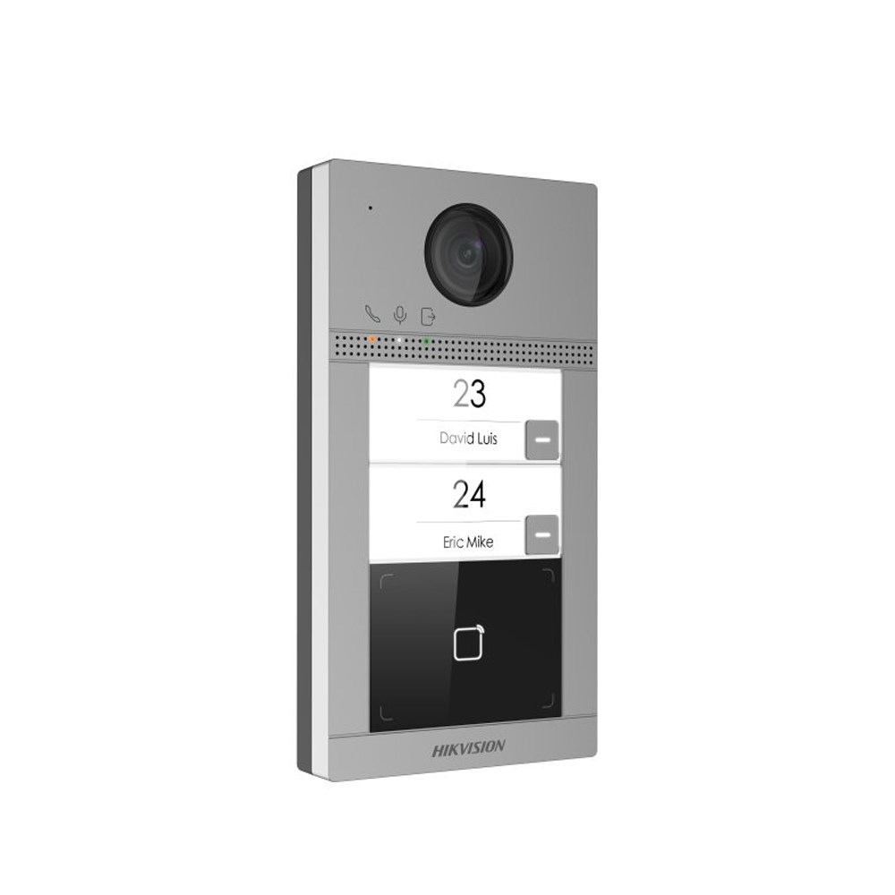 Dveřní IP stanice s kamerou a 2 tlačítky, IP systém videotelefonů Hikvision 2. generace, umožňuje volání na vnitřní jednotku(monitor) a následně na mobilní telefon prostřednictvím cloudové služby od Hikvisionu a mobilní aplikace Hik-Connect, kovový čelní panel, antivandal certifikace IK8, povrchová instalace, rozlišení kamery 2Mpx (1920x1080); WDR, úhel záběru: horizontální 124° / vertikální 75°, rozhraní LAN 10/100Mbps + WiFi, RFID čtečka čipů/karet Mifare (13,56MHz), FLASH paměť 32MB, RAM 256MB, maximální počet uložených karet/čipů: 10 000, maximální počet uložených uživatelů: 2 000, 2x kontakt pro odchodové tlačítko, 1x RS485, 4x alarmový vstup, 1x tamper, 2x NO/NC kontakt pro zámek, pro napájení zámku je nutné použít externí napájecí zdroj, napájení 12 VDC nebo standardní PoE (48V), příkon 10W, IP65, IK08, provozní teplota -40°C až +53°C, rozměry 174 × 91 × 29 mm. Pozor, jedná se o novou HW verzi dveřní jednotky s označením (C) a nesmí se použít FW z předchozí HW verze s označením (B) na konci značení!!!