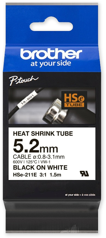 Originální tepelně smršťovací trubička Brother HSe-211E o šířce 5,2 mm je určena speciálně pro trvalé značení a identifikaci kabelů a vodičů. Při smršťovacím poměru 3:1 se doporučuje použití HSe-211E s černým tiskem na bílém podkladu pro kabely o průměru od 0,8 mm do 3,1 mm. Kompatibilní s tiskárnami štítků P-touch, které mají logo HS nebo HSe na krytu kazety s páskou.