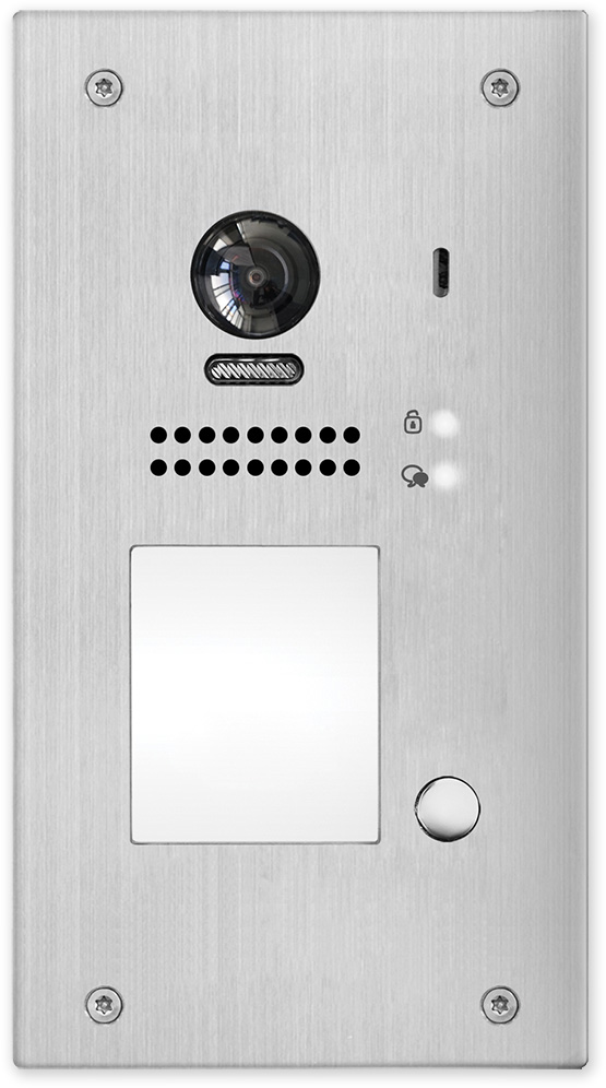 Venkovní dveřní jednotlačítková jednotka s kamerou pro zápustnou montáž. Obsahuje kameru, LED přisvícení, tlačítko zvonku, reproduktor, mikrofon, zápustnou krabici