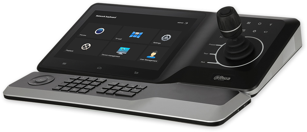 Klávesnice s ovládacím joystickem, dotyk displej 10,1" a HDMI výstupem pro obsluhu kamerového systému. Možnost přehrávání záznamů z rekordérů a ovládání PTZ kamer. HDMI/VGA výstupy na monitor. Připojení USB myši k ovládání kurzoru. Komunikace 1 x RJ45 (10/100/1000 Mbps), 1 x USB3.0, 1 x USB2.0, WLAN Wi-Fi (2,4 GHz), RS232, RS485, audio 1/1, repro. Kompatibilní s DSS Pro a CyberCity SW.