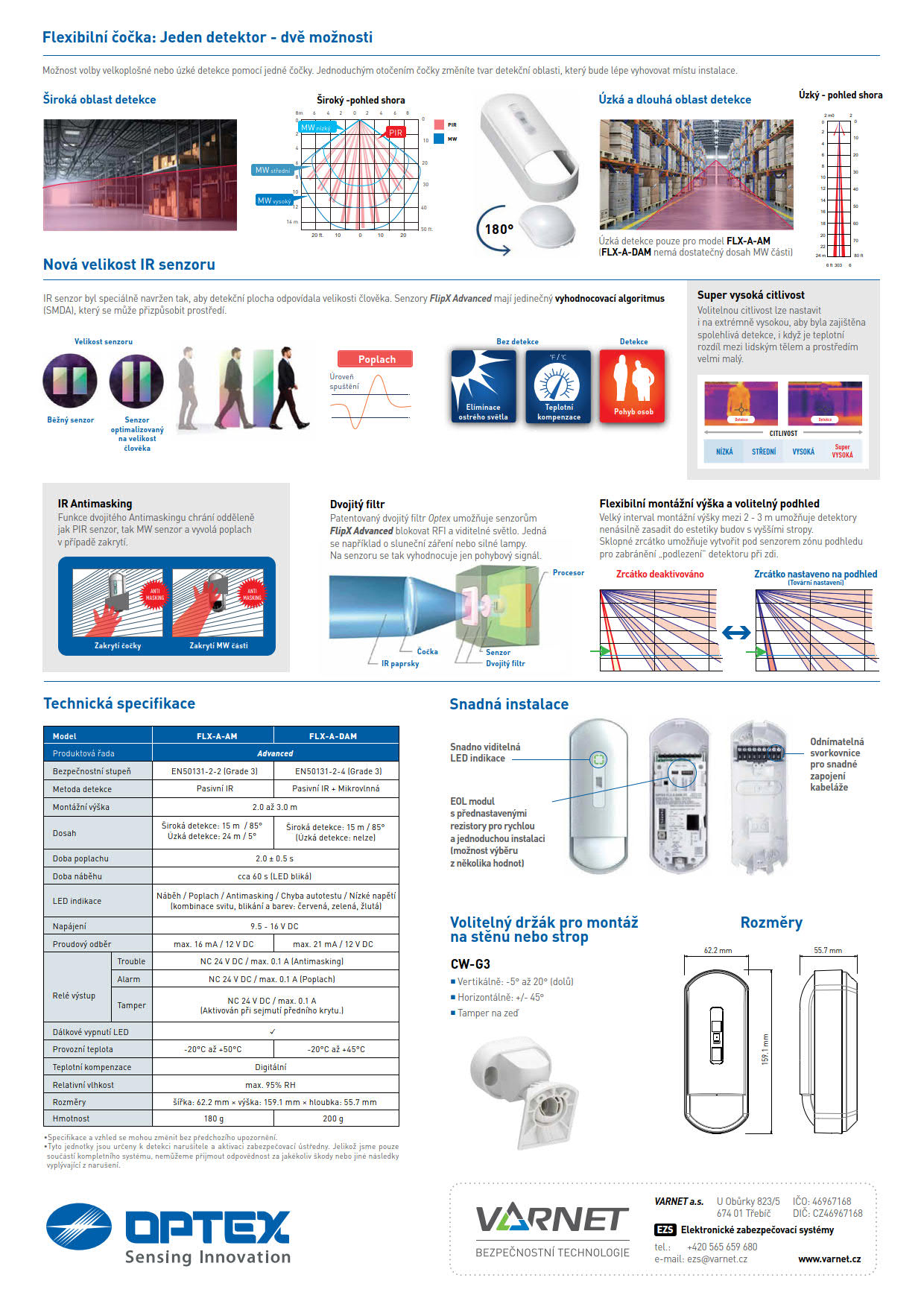 Digitální detektor do vnitřního prostředí s IR antimaskingem. Antimasking detekuje zastínění detektoru a to jak část PIR tak i MW. Kombinace detekce PIR a MW zvyšuje odolnost proti falešným poplachům způsobených sluncem nebo jinými tepelnými zdroji. Detektor používá algoritmy pro eliminaci ostrého slunečního světla a teplotní kompenzaci. Citlivost PIR lze nastavit ve třech úrovních, MW část ve dvou. Rozsah instalace 2 – 3 m umožňuje umístění detektoru pod stropem i u místností s vyššími stropy. Detekci v podhledu při vyšším umístění detektoru zajišťuje doplňková zóna realizovaná zrcátkem. Tato zóna je továrně nastavená, ale lze ji i deaktivovat sklopením zrcátka.