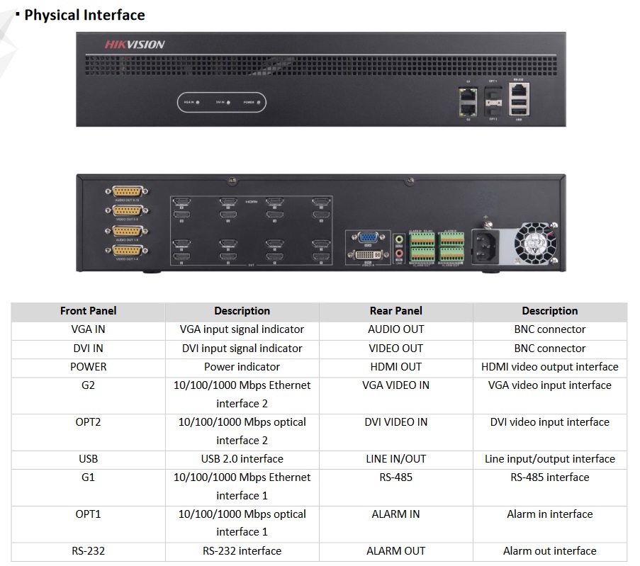 Zařízení pro dekódování streamů H.265/H.264/MPEG-4 ze zařízení Hikvision (IP kamery, NVR, …), použití pro vytváření video stěn. 2x 10/100/1000Mbps LAN, 2x uplink port 1Gbps SFP, 16x HDMI výstup (max. 4K), 1x DVI vstup, 4x VGA vstup, 1x DVI vstup, 1x RS232, 1x RS-485, Max. rozlišení streamů 12Mpix (20 sn/s, max. 16 kanálů), max. 128 kanálů (v rozlišení 2Mpix), 1x audio výstup, alarm I/O 8/8, napájení 230Vac.