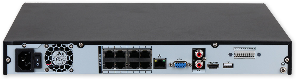 PoE napájení kamer: 8 x PoE 10/100 Mb (802.3af/at)/(max.130 W celkem) s technologií Plug & Play
