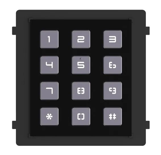Modul s číselnou klávesnicí; černá barva, první funkce: zadáním číselného kódu možnost přímého ovládání jedno relé pro dveřní zámek; druhá funkce: zadáním číselného kódu (například čísla bytu) je možní vyzvánět na rezidenta; určeno pro IP systém i 2-vodičový systém.