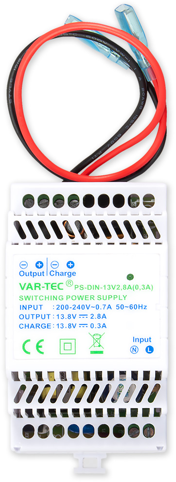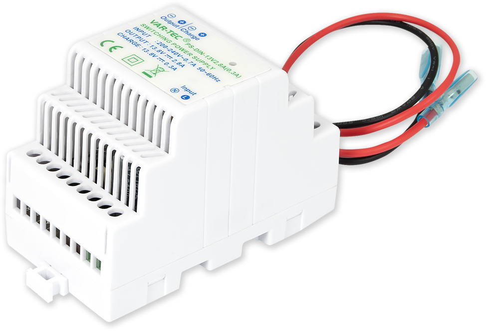 Spínaný zdroj na DIN lištu do rozvodné skříně. Výstupní napětí 13,8 V/2,8A v plastovém krytu. Napájení přímo 230 V, výstup pro připojení záložního akumulátoru (0,3 A, max. 4 Ah).