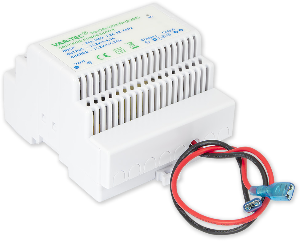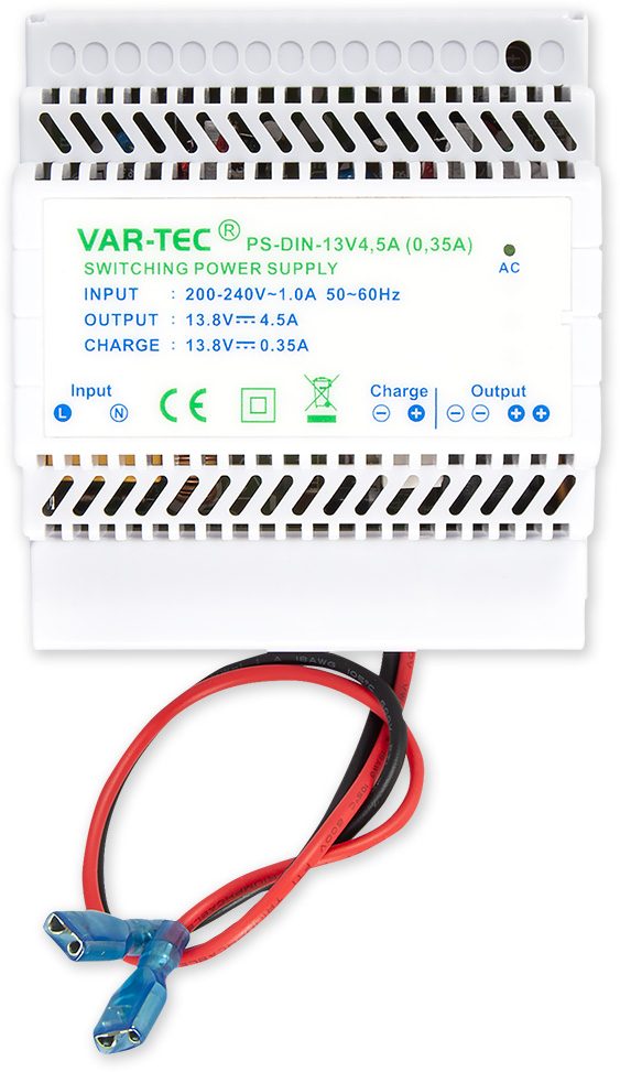 Spínaný zdroj na DIN lištu do rozvodné skříně. Zdroj má zdvojené svorky AUX. Výstupní napětí 13,8 V/4,5A v plastovém krytu. Napájení přímo 230 V, výstup pro připojení záložního akumulátoru (0,35 A, max. 7 Ah).