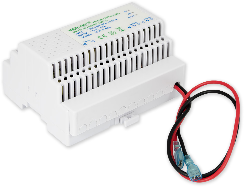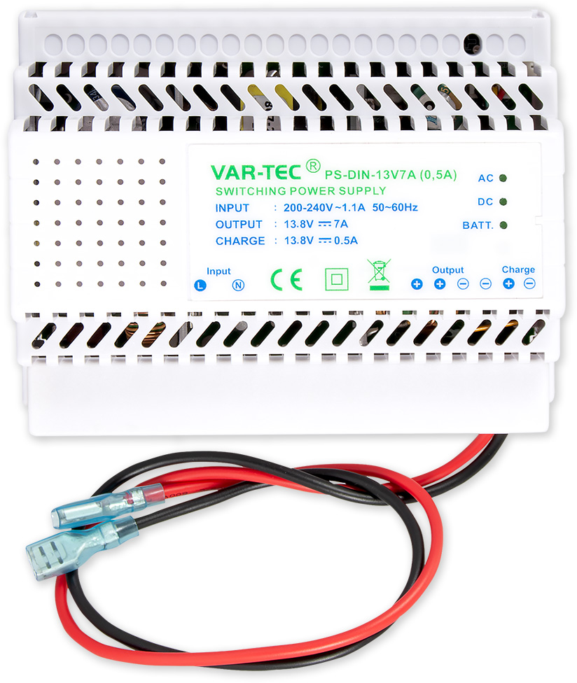 Spínaný zdroj na DIN lištu do rozvodné skříně. Zdroj má zdvojené svorky AUX. Výstupní napětí 13,8 V/7A v plastovém krytu. Napájení přímo 230 V, výstup pro připojení záložního akumulátoru (0,5 A, max. 18 Ah).