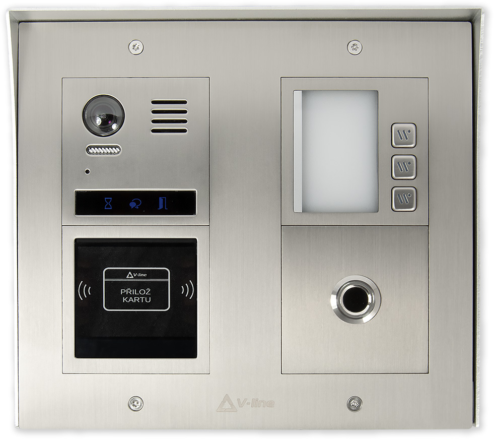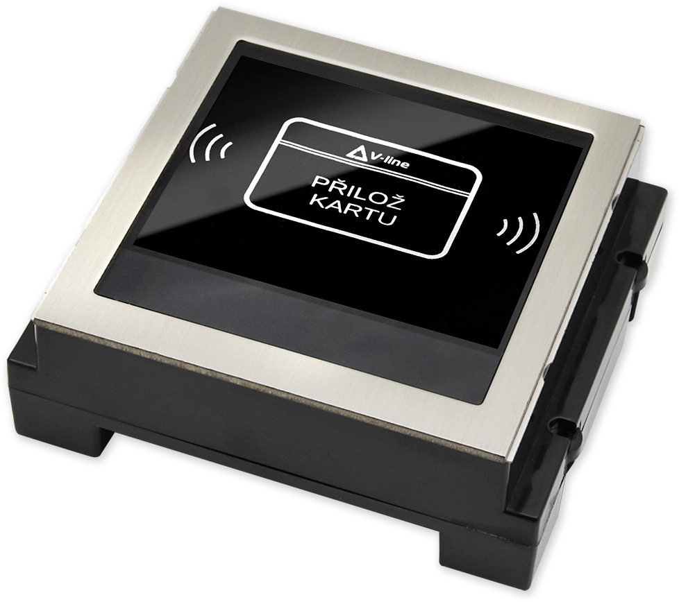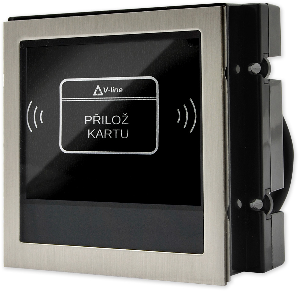 Modul externí systémové RFID čtečky. Čtečku je nutné připojit k nadřazenému vyhodnocovacímu systému(kontroléru), nelze ji připojit do systému V-LINE ani čtečku provozovat samostatně. Konstrukce pouzdra je přímo určena pro montáž do tabla (venkovní jednotky) modulárního systému domovních telefonů V-Line.