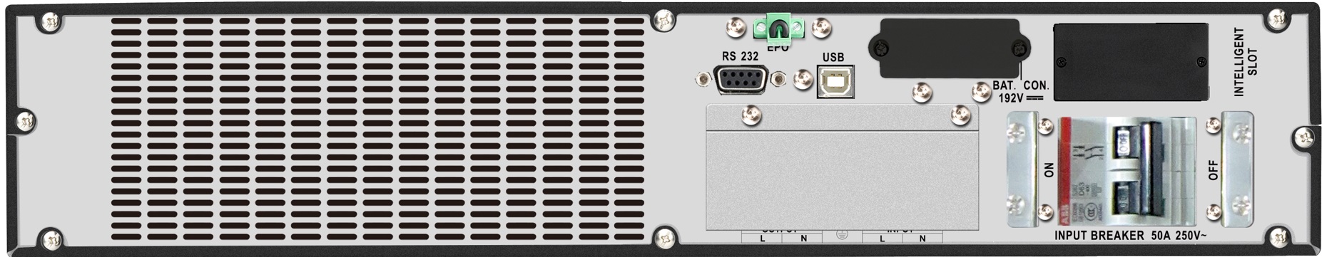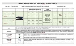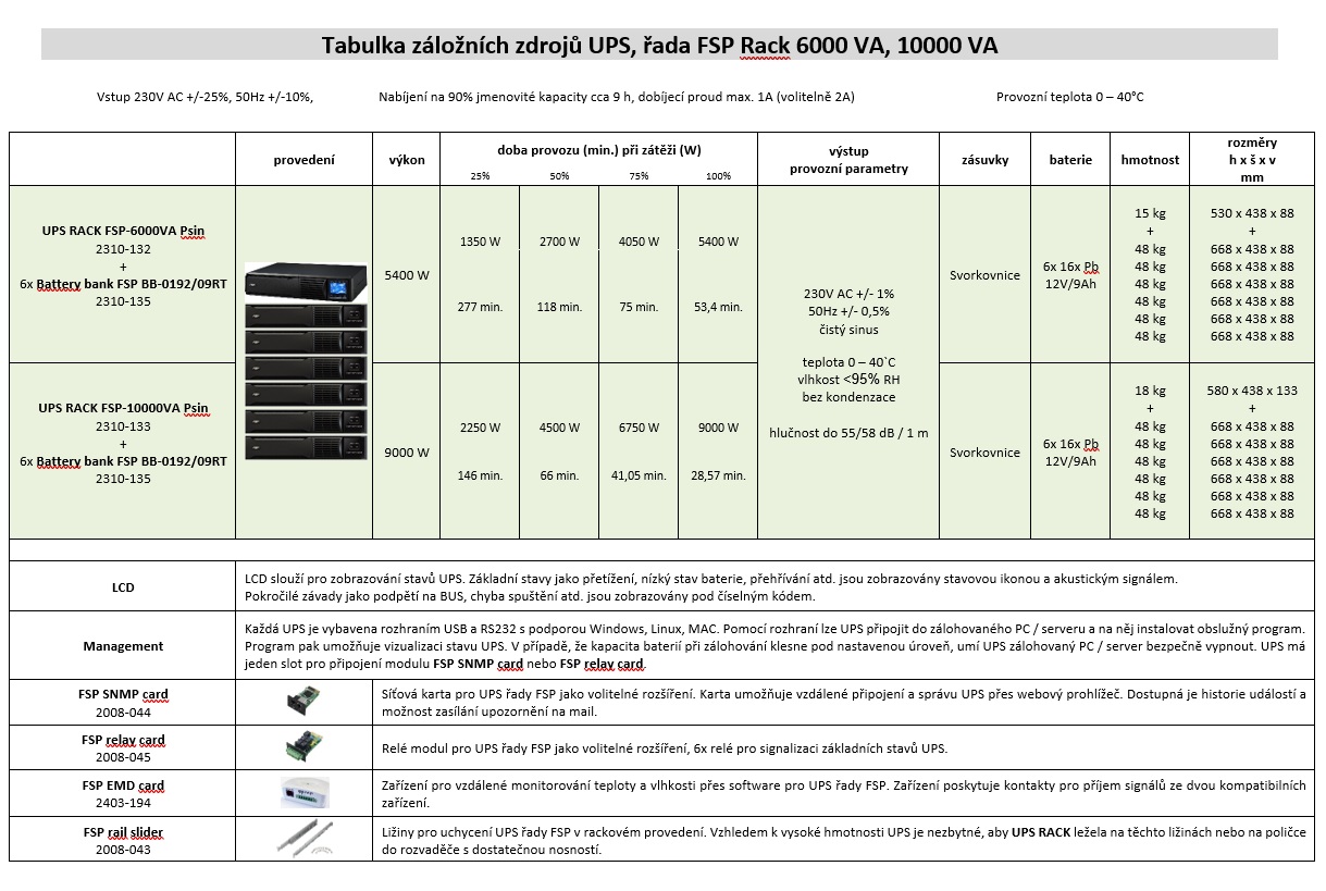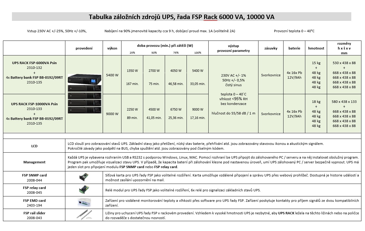Záložní zdroj UPS RACK FSP-6000VA Psin typu Online. Přehledný LCD displej na čelním panelu zobrazuje vstupní a výstupní hodnotu napětí, stav baterie a zatížení UPS. Místní monitoring UPS přes port USB nebo RS-232. Pro dálkový monitoring je možné doplnit SNMP kartu pro připojení do sítě ethernet, reléovou kartu s výstupy poruch a vstupy pro ovládání UPS nebo Modbus kartu pro řízení a monitorování v reálném čase prostřednictvím komunikačního portu RS-485.