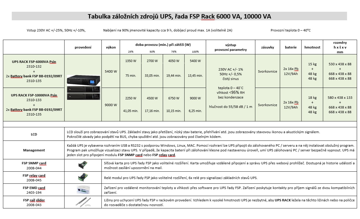 Záložní zdroj UPS RACK FSP-10000VA Psin typu Online. Přehledný LCD displej na čelním panelu zobrazuje vstupní a výstupní hodnotu napětí, stav baterie a zatížení UPS. Místní monitoring UPS přes port USB nebo RS-232. Pro dálkový monitoring je možné doplnit SNMP kartu pro připojení do sítě ethernet, reléovou kartu s výstupy poruch a vstupy pro ovládání UPS nebo Modbus kartu pro řízení a monitorování v reálném čase prostřednictvím komunikačního portu RS-485.