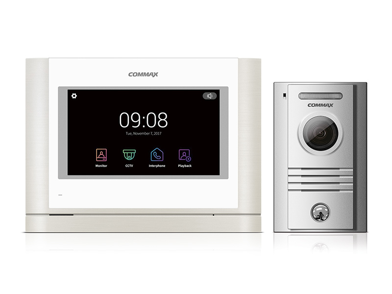 Sada handsfree videotelefonu s 7" dotykovou HD Ready obrazovkou a celokovové dveřní stanice s povrchovou montáží. Videotelefon má videopaměť a umožňuje adresnou interkomovou komunikaci s dalšími videotelefony na stejné adrese.