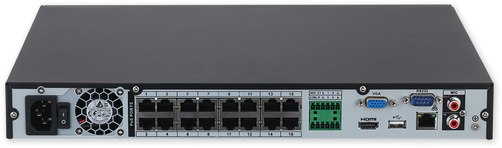 PoE napájení kamer: 16 x PoE 10/100 Mb (802.3af/at)/(max.130 W celkem) s technologií Plug & Play