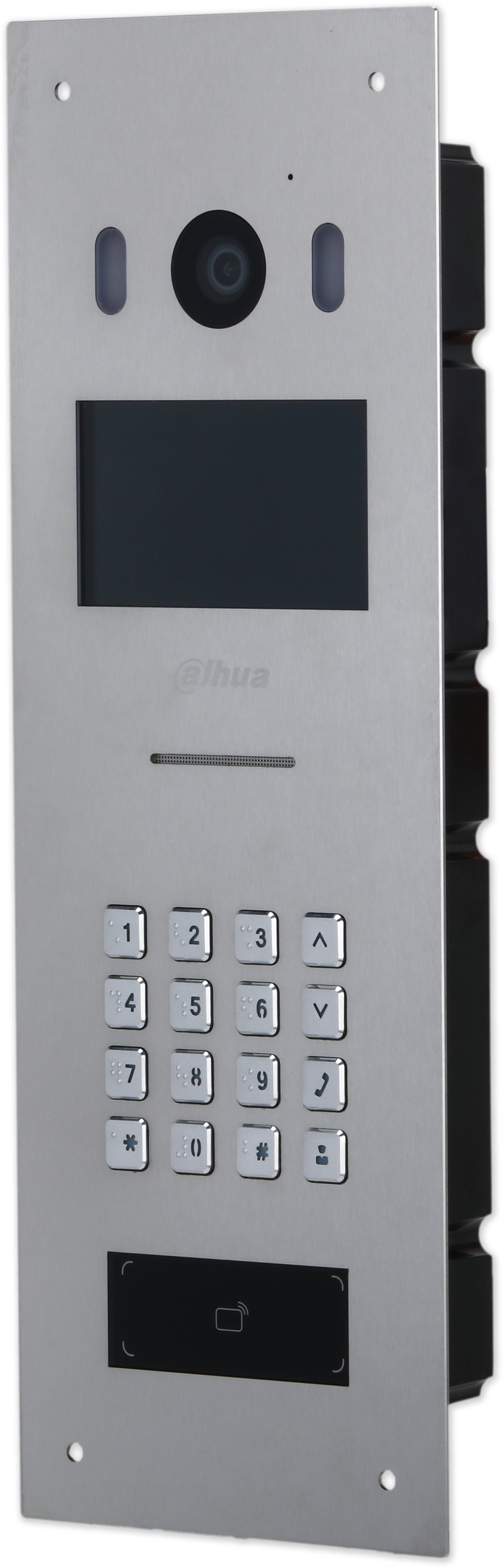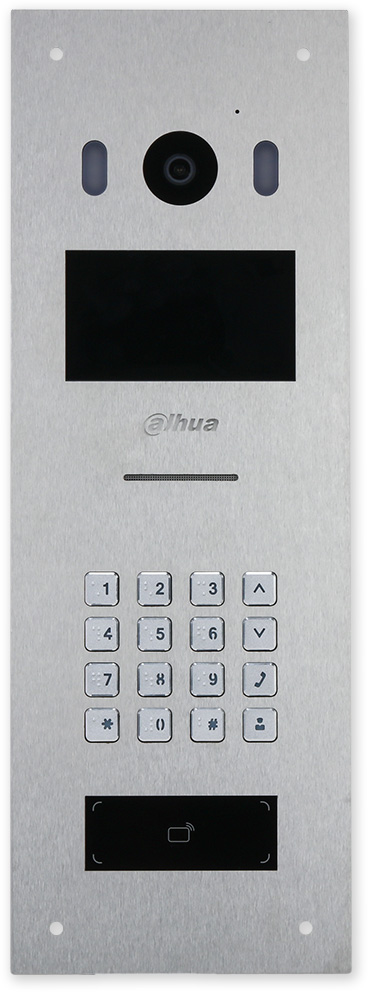 Venkovní IP jednotka s kamerou, klávesnice, čtečka RFID pro více účastníků. 2Mpix kamera s vysokým dynamickým rozsahem, 4,3" IPS displej, mechanická kódovou klávesnicí a čtečku MiFare 13,56 MHz. Jednotka je kompatiblní s ostatními zařízeními systému videotelefonů (VDP) DAHUA. Pomocí SIP lze použít i v kombinaci se zařízeními 3. stran. Účastníky lze zavolat výběrem na displeji nebo pomocí kódové volby. Jednotliví uživatelé se mohou autorizovat (otevřít dveře) pomocí karet/čipů či zadáním kódu pomocí klávesnice.
