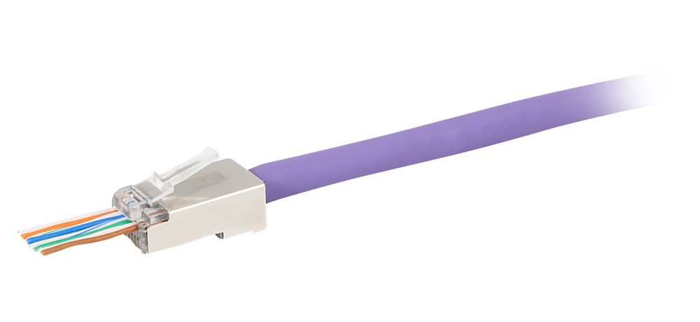 EASY konektor RJ45 Cat.5e STP pro datový kabel, pro vodič drát. K zapojení konektoru je nutné použít krimpovací kleště CT-200. Vodiče jsou při zapojování protaženy konektorem pro jejich snadnější kontrolu. Při zalisování dojde k jejich odstřižení.