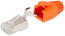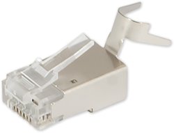 Konektor RJ45 stíněný s vložkou pro datový kabel STP CAT6A a CAT7. Ke krimpování těchto kontektorů jsou určeny kleště CT-208 - nutné odejmutí části, která se používá pro zatlačení plastové pojistky u standardních konektorů.