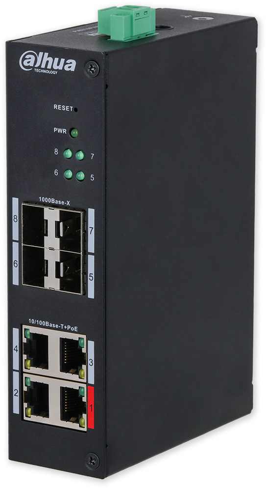 Výkonný průmyslový PoE switch s web management L2, metalickou i optickou páteří, 4 x PoE 10/100 Mbps, 4 x SFP uplink 1000 Mbps, PoE norma 3af (15,4 W), 3at (30 W), Hi-PoE (60 W), 3bt Hi-PoE (90 W), celkový budget je 96 W, přepěťové ochrany, desktop a DIN-Rail provedení, napájení z externího adaptéru 48-57 VDC (součástí balení).
