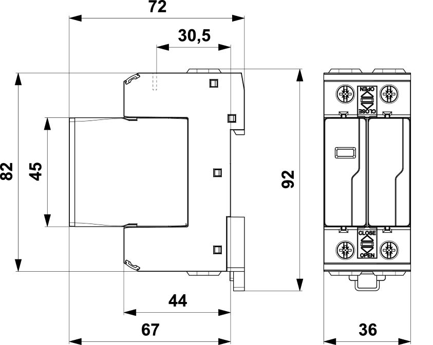 Rozměry: š 36 x v 90 x h 72 mm