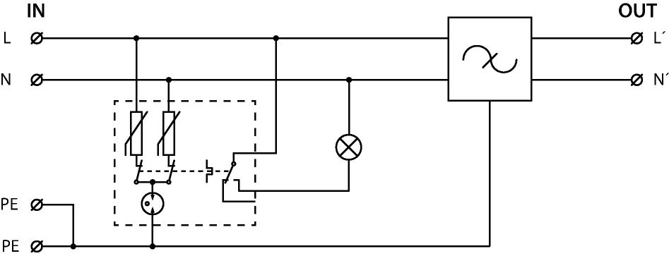 Přepěťová ochrana s vf filtrem, instalace do rozvodů NN těsně před chráněné zařízení, 230 V/10 A, optická signalizace poruchy, k ochraně napájení řídicích systémů MaR, EZS, EPS apod. proti pulsnímu přepětí a vf rušení.