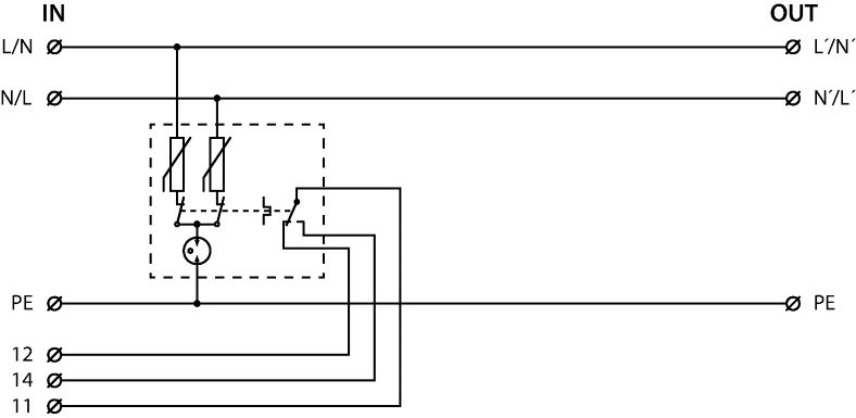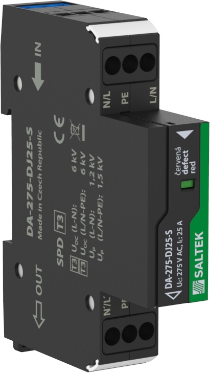 Průchozí přepěťová ochrana pro univerzální použití k ochraně všech druhů elektrických a elektronických zařízení nn proti pulsnímu přepětí, instalace do rozvodů NN těsně před chráněné zařízení, vhodné pro systémy TN a TT, 230 V/25 A, dálková a optická signalizace poruchy, k ochraně zařízení proti účinkům indukovaného přepětí při úderu blesku a proti spínacímu přepětí.