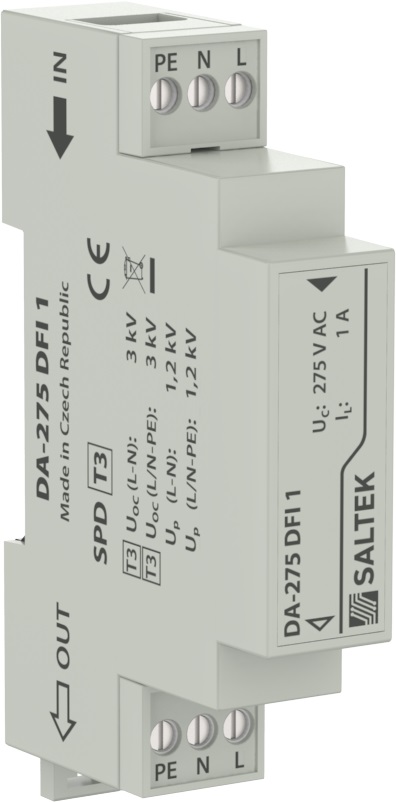 Přepěťová ochrana s vf filtrem, instalace do rozvodů NN těsně před chráněné zařízení, 230 V/1 A, signalizace poruchy přerušením napájení, k ochraně napájení řídicích systémů MaR, EZS, EPS apod. proti pulsnímu přepětí a vf rušení, priorita ochrany.