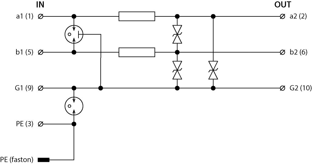 Svodič bleskových proudů s hrubou a jemnou přepěťovou ochranou dvou-/tří-žilových plovoucích signálových linek, instalace na vstupu do budovy těsně před chráněné zařízení, 12 V DC, max. 1 A, vyjímatelný modul, vazební impedance (R – odpor), linka od ochranné země oddělena pomocí bleskojistky, k ochraně rozhraní řídicích systémů MaR, EZS, EPS apod., zejména rozhraní RS 485, před pulsním přepětím, proti podélnému přepětí (linka - ochranná zem) hrubá ochrana a proti příčnému přepětí (žíla – žíla, GND) hrubá i jemná přepěťová ochrana.