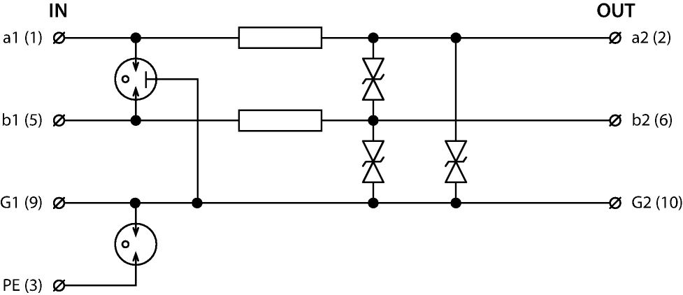 Svodič bleskových proudů s hrubou a jemnou přepěťovou ochranou dvou-/tří-žilových signálových linek, instalace na vstupu do budovy i těsně před chráněné zařízení, 24 V DC, max. 2 A, signálová zem oddělena od ochranné země, vyjímatelný modul, vazební impedance (R – odpor), linka od ochranné země oddělena pomocí bleskojistky, k ochraně rozhraní řídicích systémů MaR, EZS, EPS apod., zejména rozhraní RS 485 a PROFIBUS, před pulsním přepětím, proti podélnému přepětí (linka–ochranná zem) hrubá ochrana a proti příčnému přepětí (žíla–žíla, GND) hrubá i jemná přepěťová ochrana.