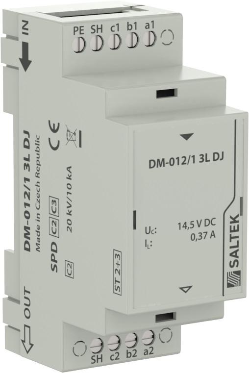 Dvoustupňová přepěťová ochrana třížilových signálových linek, instalace těsně před chráněné zařízení, 12 V DC, max. 370 mA, vazební impedance (L - indukčnost), k ochraně rozhraní řídicích systémů MaR, EZS, EPS apod., zejména rozhraní RS 485, před pulsním přepětím, proti podélnému přepětí (žíla–ochranná zem) hrubá přepěťová ochrana, proti příčnému přepětí (žíla – žíla) hrubá i jemná přepěťová ochrana.