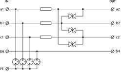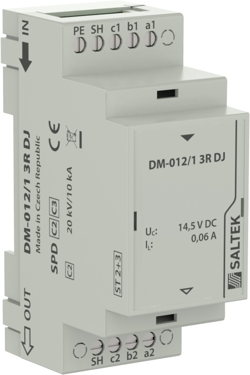 Dvoustupňová přepěťová ochrana třížilových signálových linek, instalace těsně před chráněné zařízení, 12 V DC, max. 60 mA, vazební impedance (R – odpor), k ochraně rozhraní řídicích systémů MaR, EZS, EPS apod., zejména rozhraní RS 485, před pulsním přepětím, proti podélnému přepětí (žíla–ochranná zem) hrubá přepěťová ochrana, proti příčnému přepětí (žíla – žíla) hrubá i jemná přepěťová ochrana.