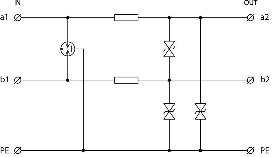 Dvoustupňová přepěťová ochrana dvoužilových signálových linek, instalace těsně před chráněné zařízení, 12 V DC, max. 0,5 A, vazební impedance (R – odpor), k ochraně rozhraní řídicích systémů MaR, EZS, EPS apod., zejména rozhraní RS 485, před pulsním přepětím, proti podélnému přepětí (žíla–ochranná zem) hrubá přepěťová ochrana, proti příčnému přepětí (žíla – žíla) hrubá i jemná přepěťová ochrana.